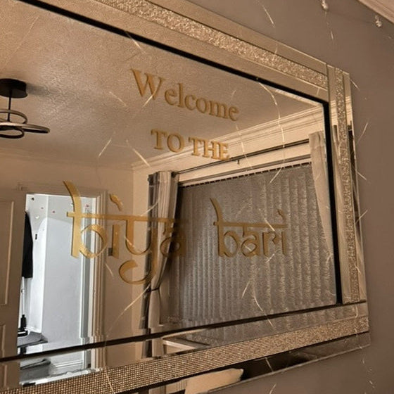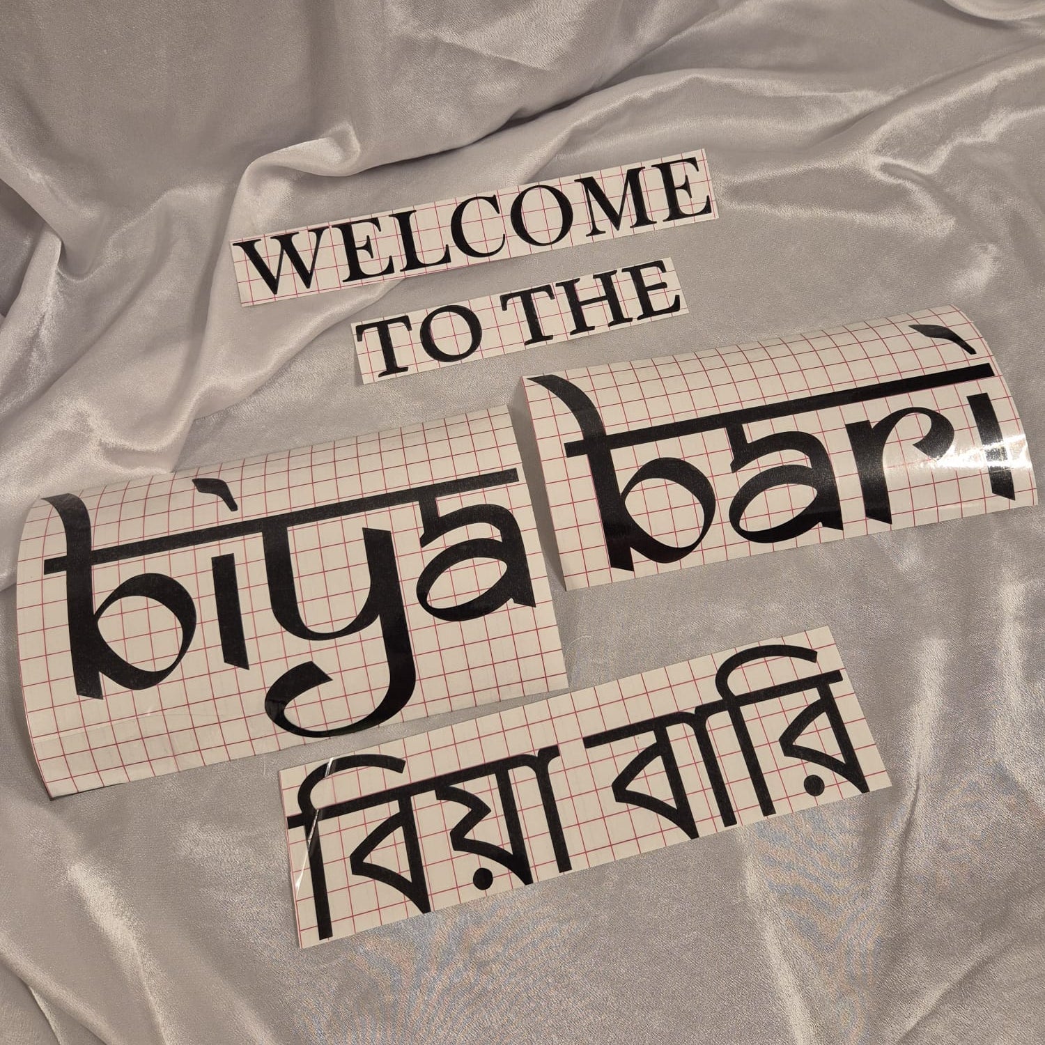 Welcome to the Biya Bari with Bangla wedding sign vinyl decal - a beautiful combination of English and Bengali text for your special celebration.